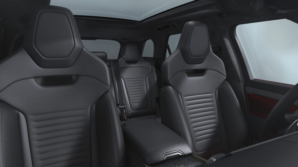 The interior features Ebony Windsor seats drawn from the performance flagship Range Rover Sport SV. Lightweight, sculpted and inspired by motorsport, they combine precision engineered ergonomics with luxury craftsmanship. Forged carbon veneers and a black suedecloth headlining bestow a dynamically dark ambience on the cabin.
